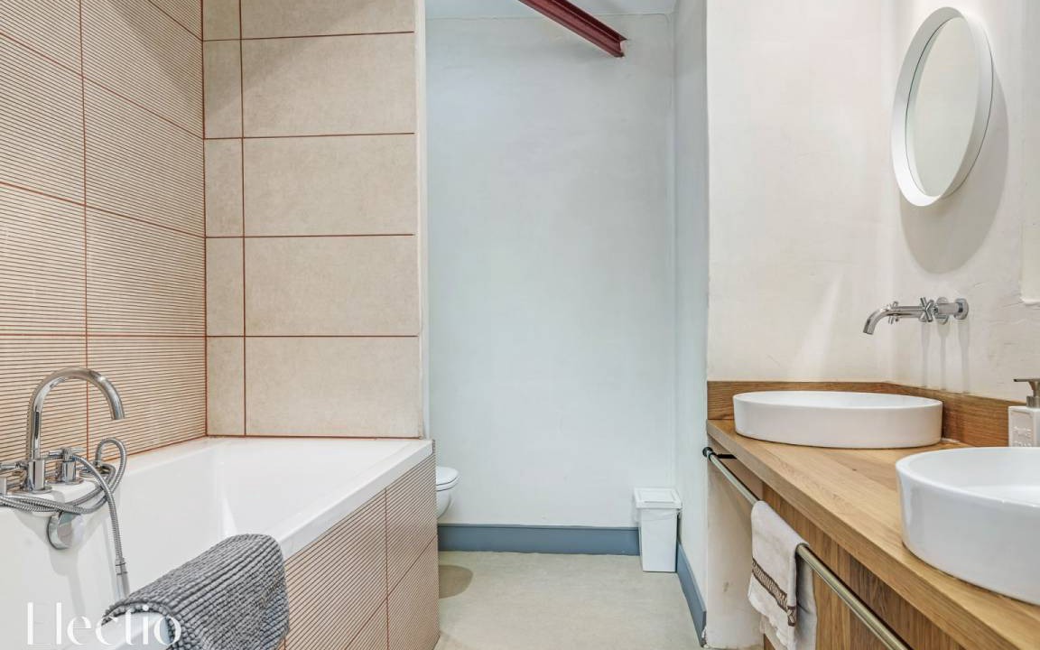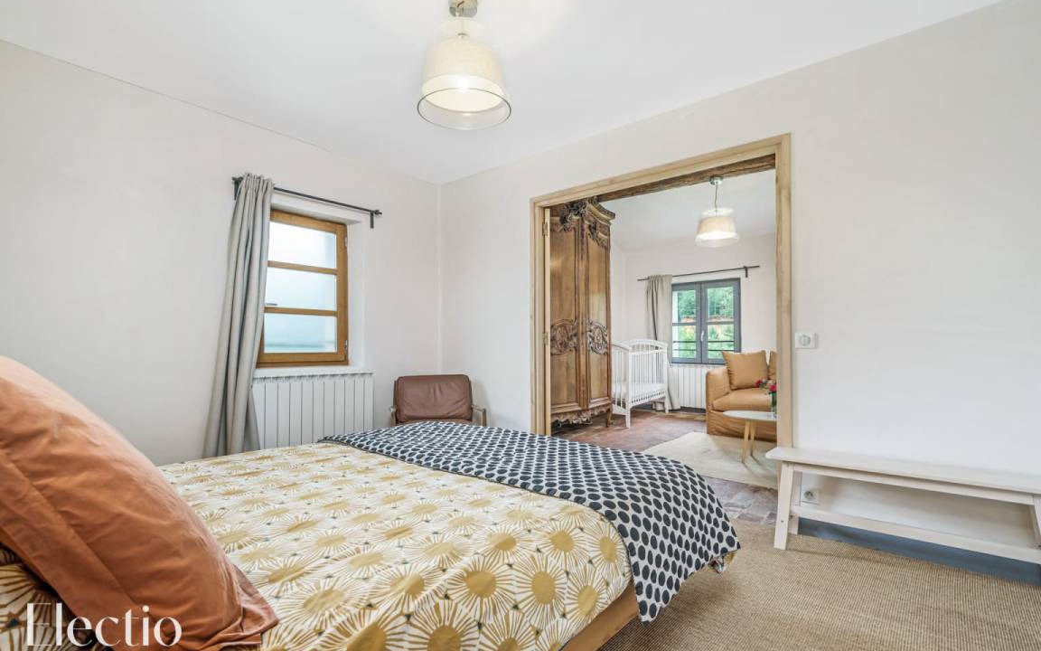 The Cousines room is the largest suite, composed of two rooms. The first, majestic with its 50 m² and its high ceiling, presents beautiful exposed beams, a double bed in 180 cm and a living room with a small glass desk and a vintage wooden pram. The second bedroom, formerly a dovecote, is equipped with a double bed in 140, an armchair and 2 child beds. This suite is completed by a bathroom with tiled shower, bathtub, two sinks and a separate WC.