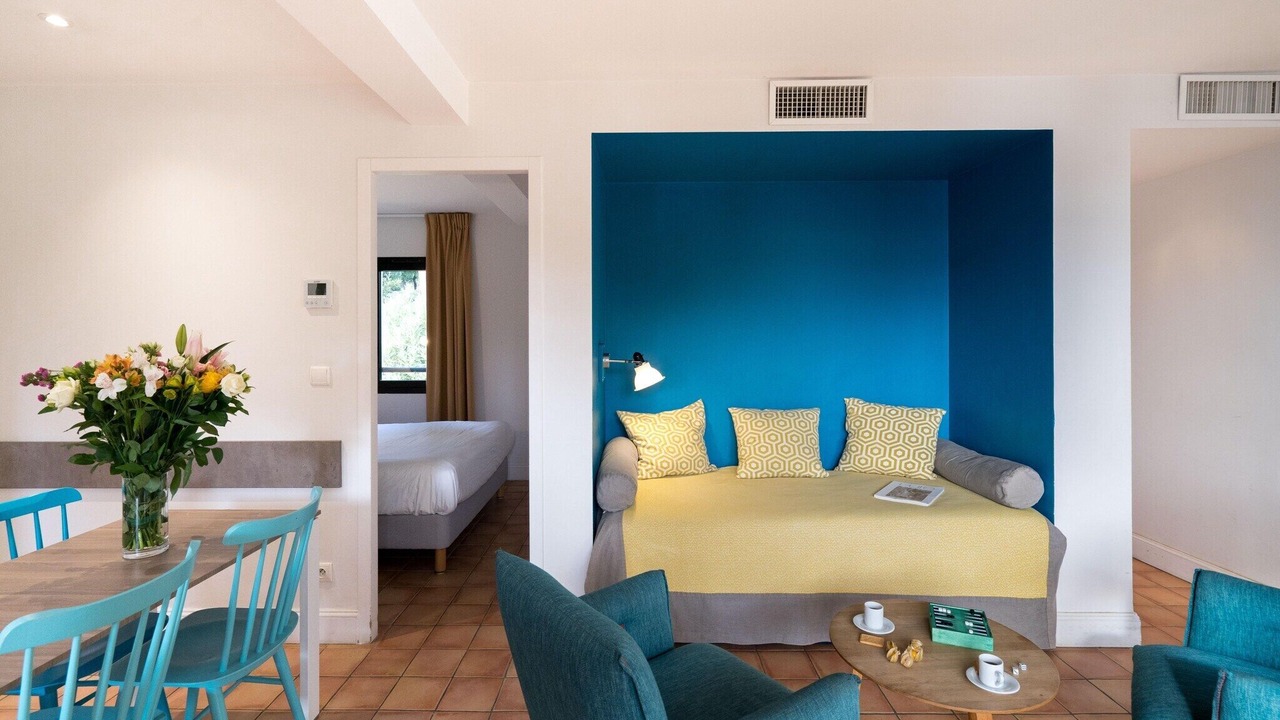 Small holiday residence with direct access to the beach of the Gulf of Saint-Tropez, surrounded by a well-kept Mediterranean garden. The 19 apartments are air-conditioned and all have free WiFi. The apartments on the 1st and 2nd floor offer you a sea view. So you can already let your eyes wander while having breakfast on the balcony! The wellness area at the heart of the Domaine du Bailli offers you a place between sky and sea where you can enjoy a relaxing massage or a steam bath. Or you can visit the Hotel La Bailli de Suffren, 50 meters away, where you can have a delicious meal in one of the three restaurants for a fee. The hotel's communal outdoor pool, which you can also use for a fee (EUR 8.00 per person/day), provides refreshment.