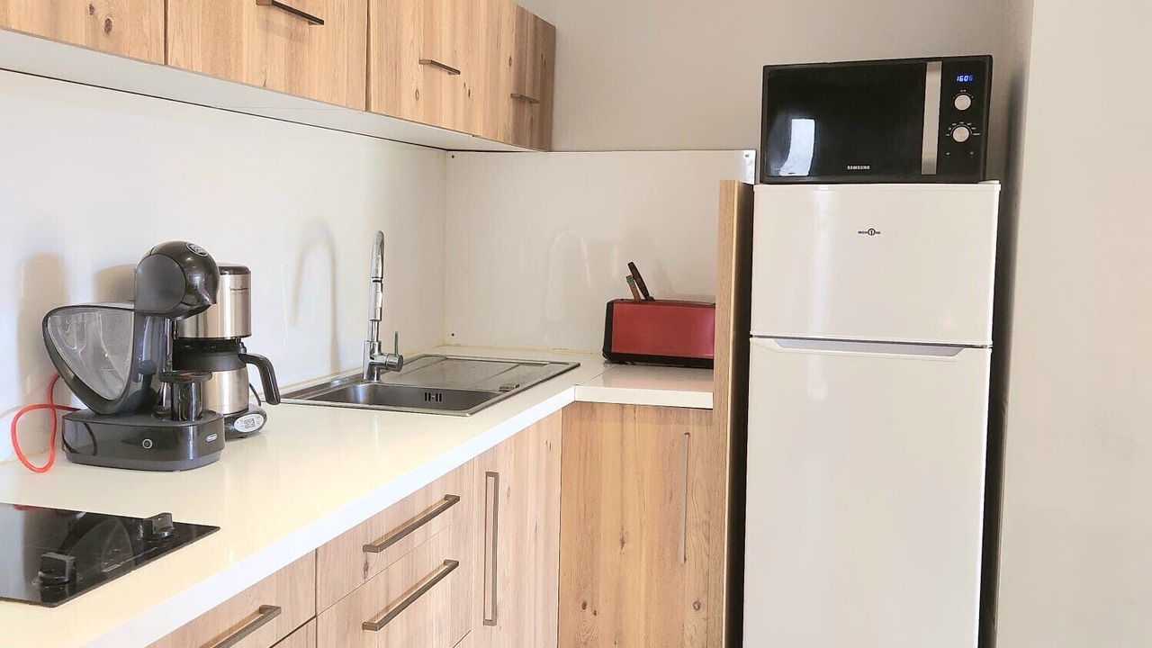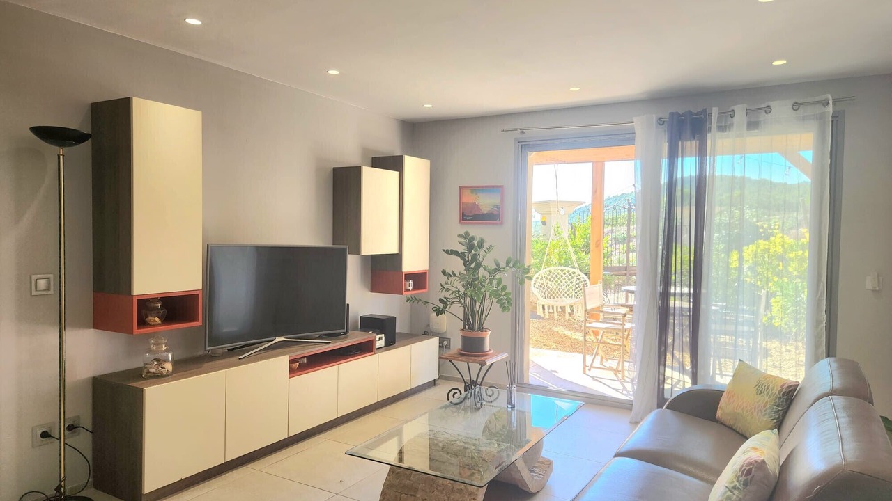 Nestled in a private estate, this 60 m² ground-floor apartment offers all the comfort for a pleasant stay in Provence. It includes a large bedroom with a double bed, a spacious living room, and a fully equipped open kitchen. The modern bathroom features a shower, with separate toilets for added comfort.