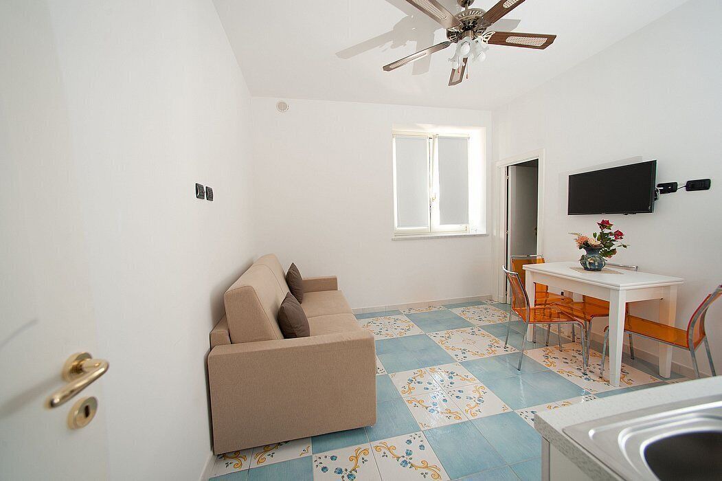The living room is paved with majolica tiles with handmade decoration, in the characteristic style of the Amalfi Coast. The furnishings are simple and comfortable. The furnishings include a divan that unfolds into a double bed. In the living room you will also find a cooking area. The kitchenette is equipped with a four-burner gas cooker, an electric oven, a refrigerator with freezer and an Italian-style coffee-maker. The dining table can accommodate four guests. In this room you will find a television (local channels). The room has a window. It is equipped with an air conditioning/heating unit. Here you will also find a ceiling fan.