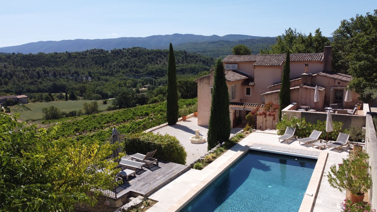 La propriété qui est située sur un terrain de 1,8 ha, comporte trois jolies terrasses avec fontaine provençale et une grande cour, en contrebas d’une piscine chauffée (quand les conditions climatiques le permettent avec supplément de 300€) offrant une vue panoramique exceptionnelle sur les vignes de la propriété ainsi qu’un poolhouse.