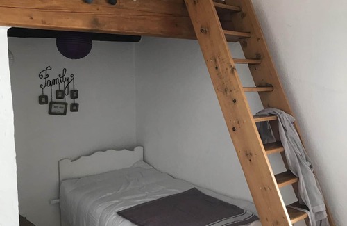 This apartment offers the charm of the old: parquet, beams, exposed stones. Renovated recently, the bathroom consists of a large bathtub, a sink and a built - in vanity unit. The master bedroom seduced by the charm of its stone walls and allows the sleeps of two people (double bed 140 cm). The other smaller room consists of two single beds, one of which is on the mezzanine (not suitable for children under 6 years old). A corridor leads to the two bedrooms, the WC and the access to the 20 m² terrace. A sofa bed in the living room can accommodate two additional beds. A cot can be provided on request. The apartment is equipped with everything needed to ensure a pleasant stay: barbecue, garden table, deckchair, DVD player, television, microwave, card and board games. The decoration being renovated is neat and up to date.