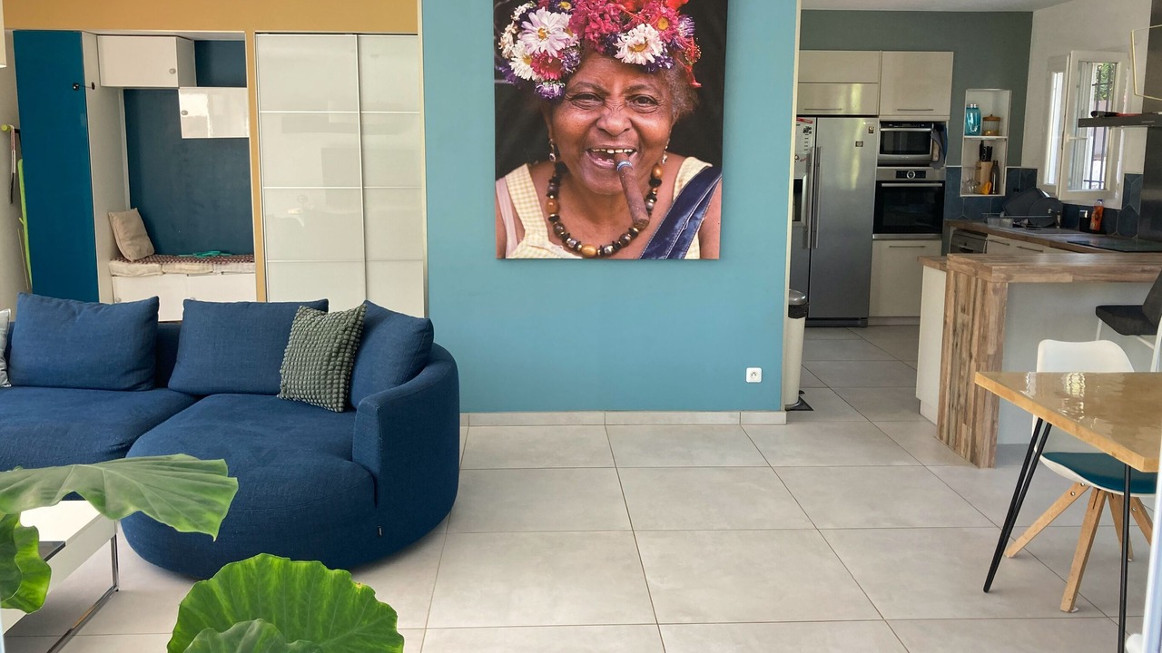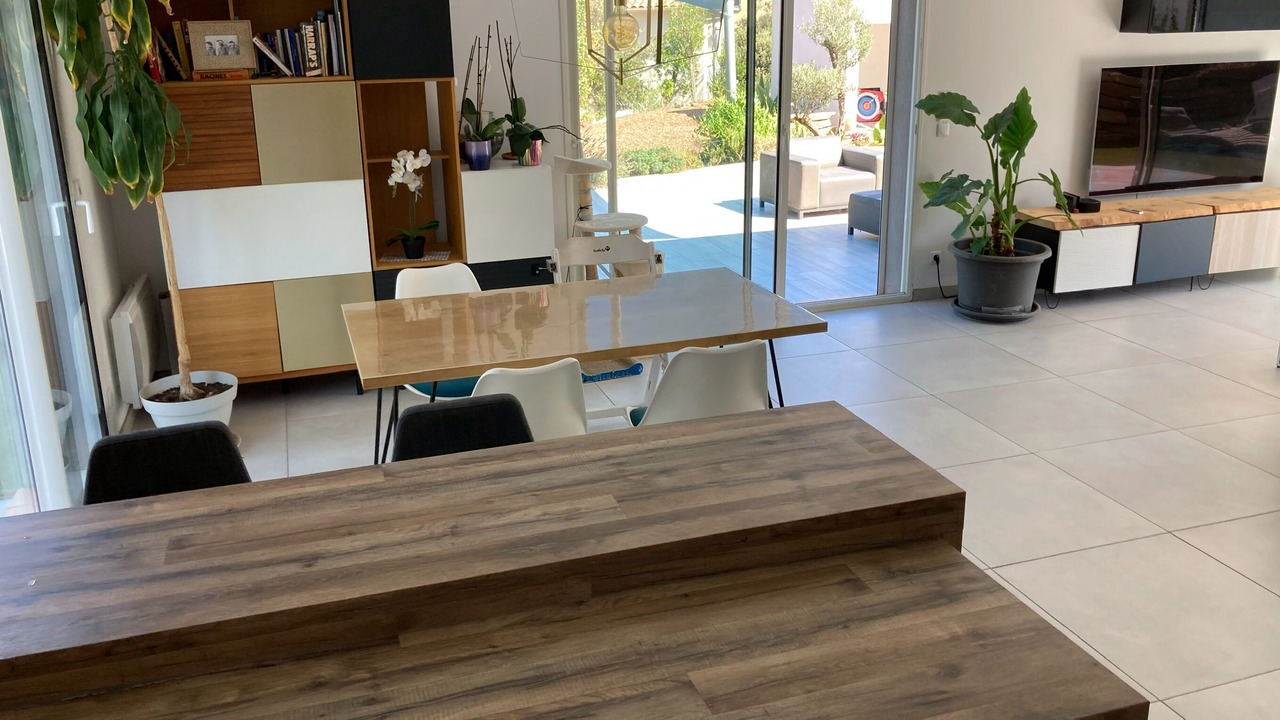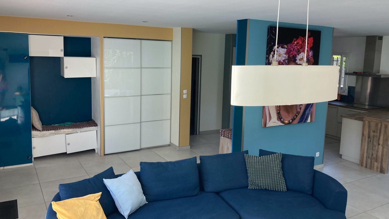 - A large living room (50m²), including fully equipped kitchen opening onto a shaded terrace