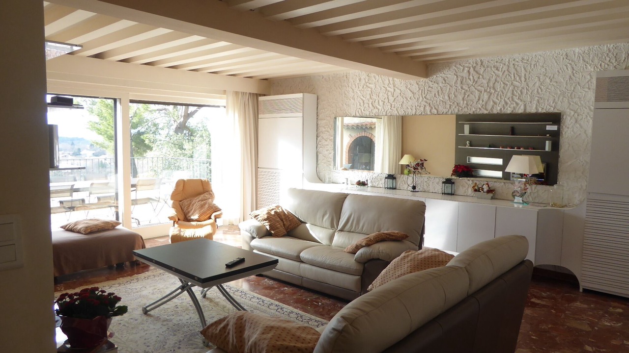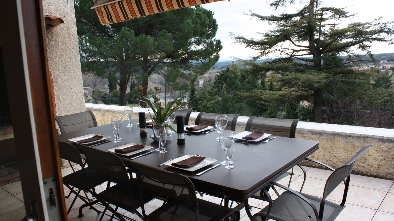 A large interior living space overlooking a terrace with BBQ and open views of the village of Aups, a dining room in a tower, three other individual terraces equipped kitchen with 2 fridges, 5 rooms with direct access from the terrace to to accommodate, in comfort, 8 adults and 2 children in bunk beds. A bathroom, a shower room, 4 toilets, a Roman sauna with shower and a rest room and relaxation. Laundry area with washer and dryer.