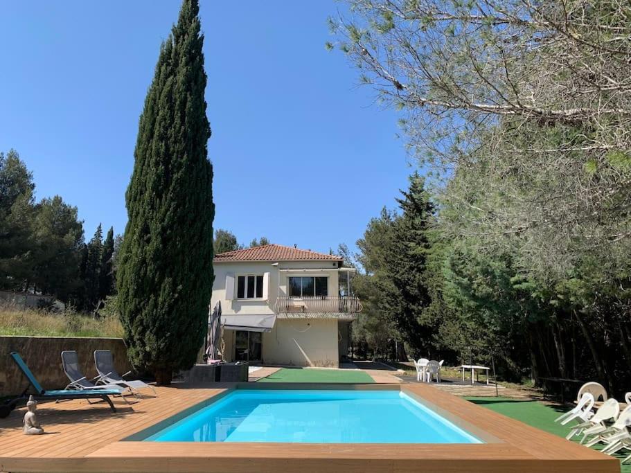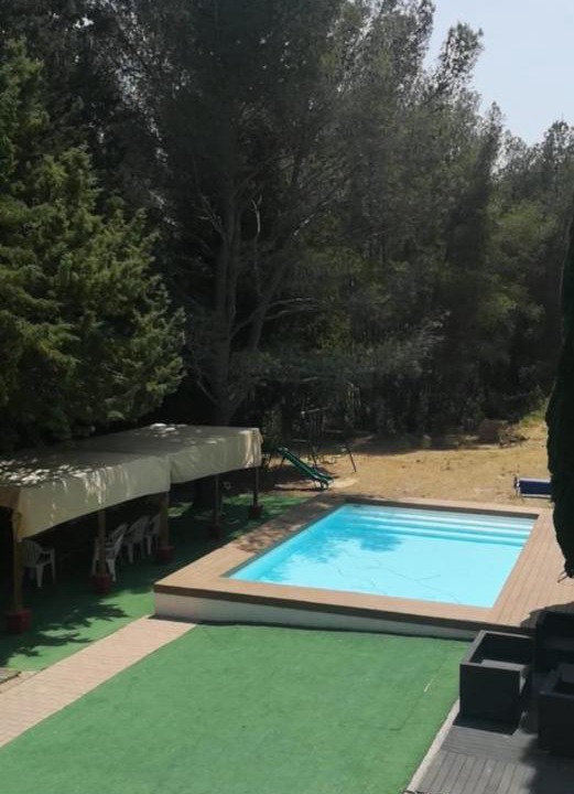Food & DrinkTea/Coffee makerBathroomHairdryer, Toilet paper, Toilet, Shower, Private bathroomMedia & TechnologyTV, Flat-screen TVGeneralIron, Heating, Fan, Ironing facilities, Fire extinguisher, Private entrance, Air conditioning, Hypoallergenic, Trash cans, Smoke Alarm, SoundproofKitchenMicrowave, Stovetop, Electric kettle, Refrigerator, Washing machine, Dryer, Toaster, Cleaning products, Coffee machine, Kitchen, Dining table, Wine glasses, Oven, KitchenwareLiving AreaSofa, Sitting area, Dining areaOutdoorsOutdoor dining area, Outdoor furniture, Terrace, Private poolBedroomLinens, Wardrobe or closetAccessibilityEntire unit located on ground floorBuilding CharacteristicsSemi-detached, DetachedRoom AmenitiesHypoallergenic pillow, Drying rack for clothing, Socket near the bed, Sofa bedPool and SpaHeated pool |