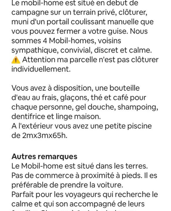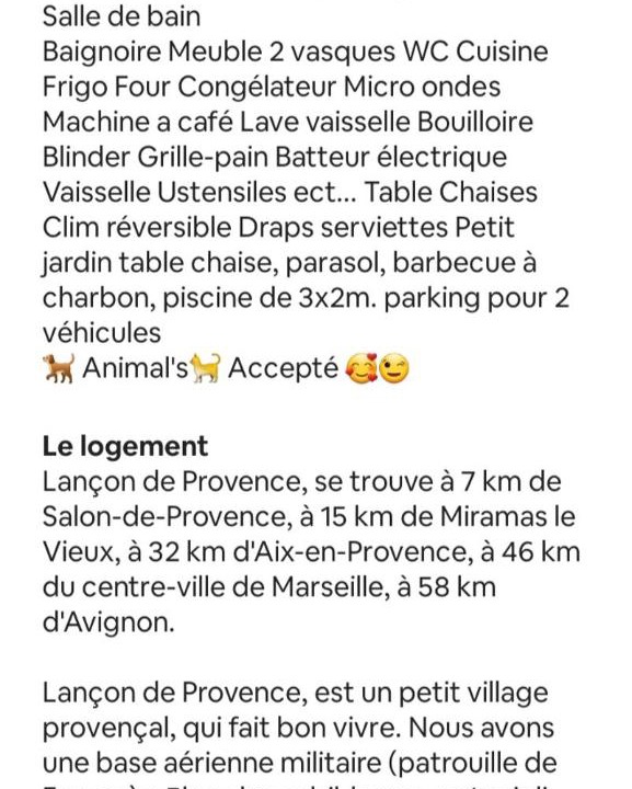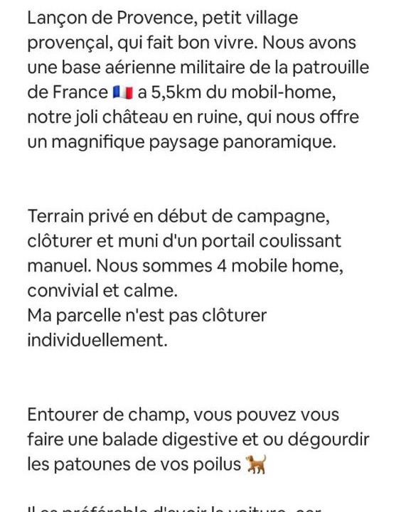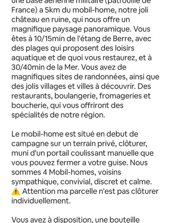 This Mobile Home de Charme 4 Personnes Sans Wifi in Lançon-Provence is well equipped and has all facilities that have been listed below. Please note that these details were shared to us by booking.com for the listed “Mobile Home de Charme 4 Personnes Sans Wifi”. We solely rely on their shared details and are regarded as “accurate”. If you have any concerns about the information or accuracy describing this House, please let us know.