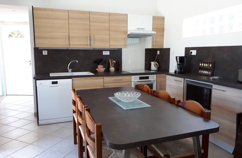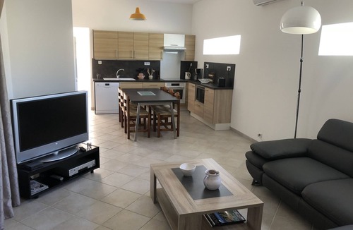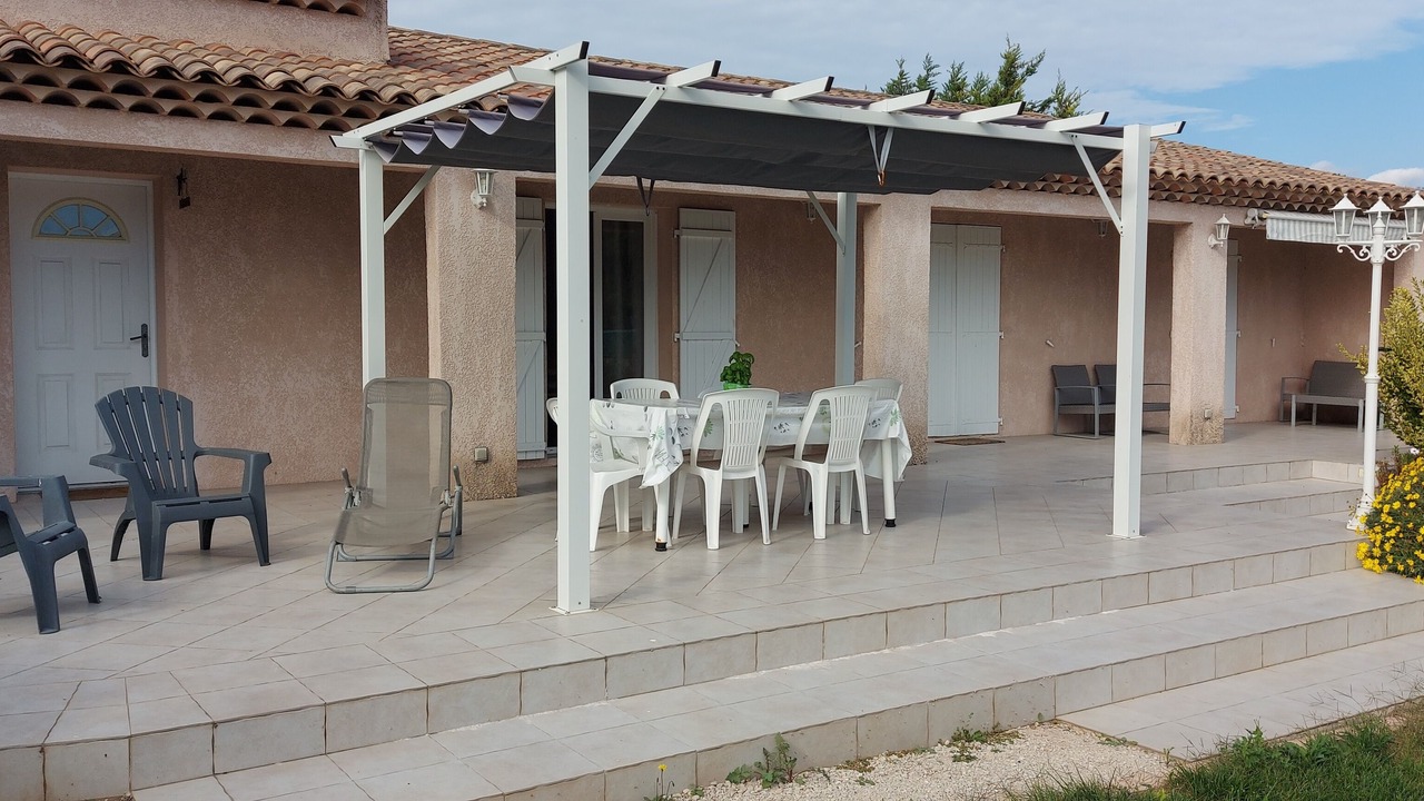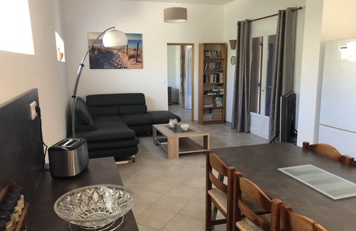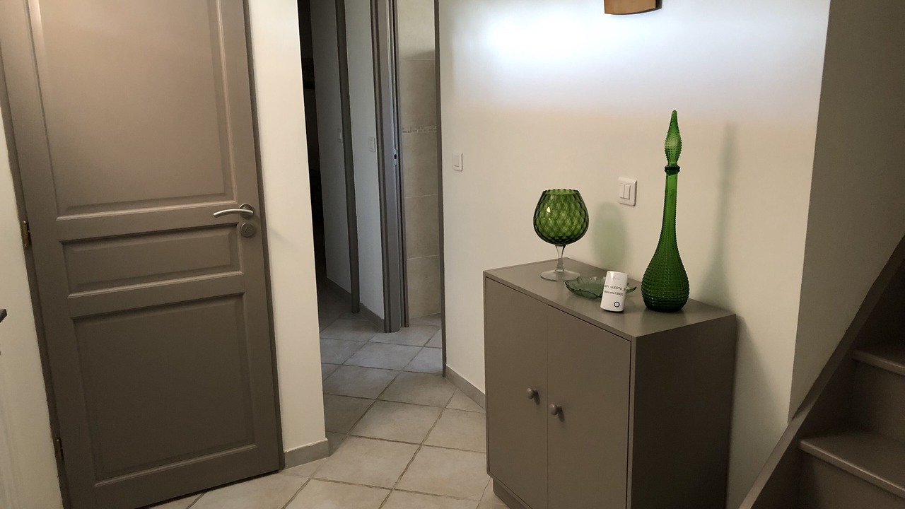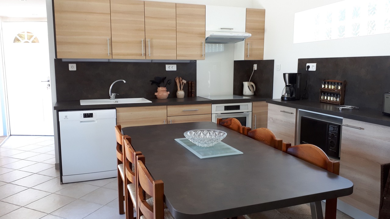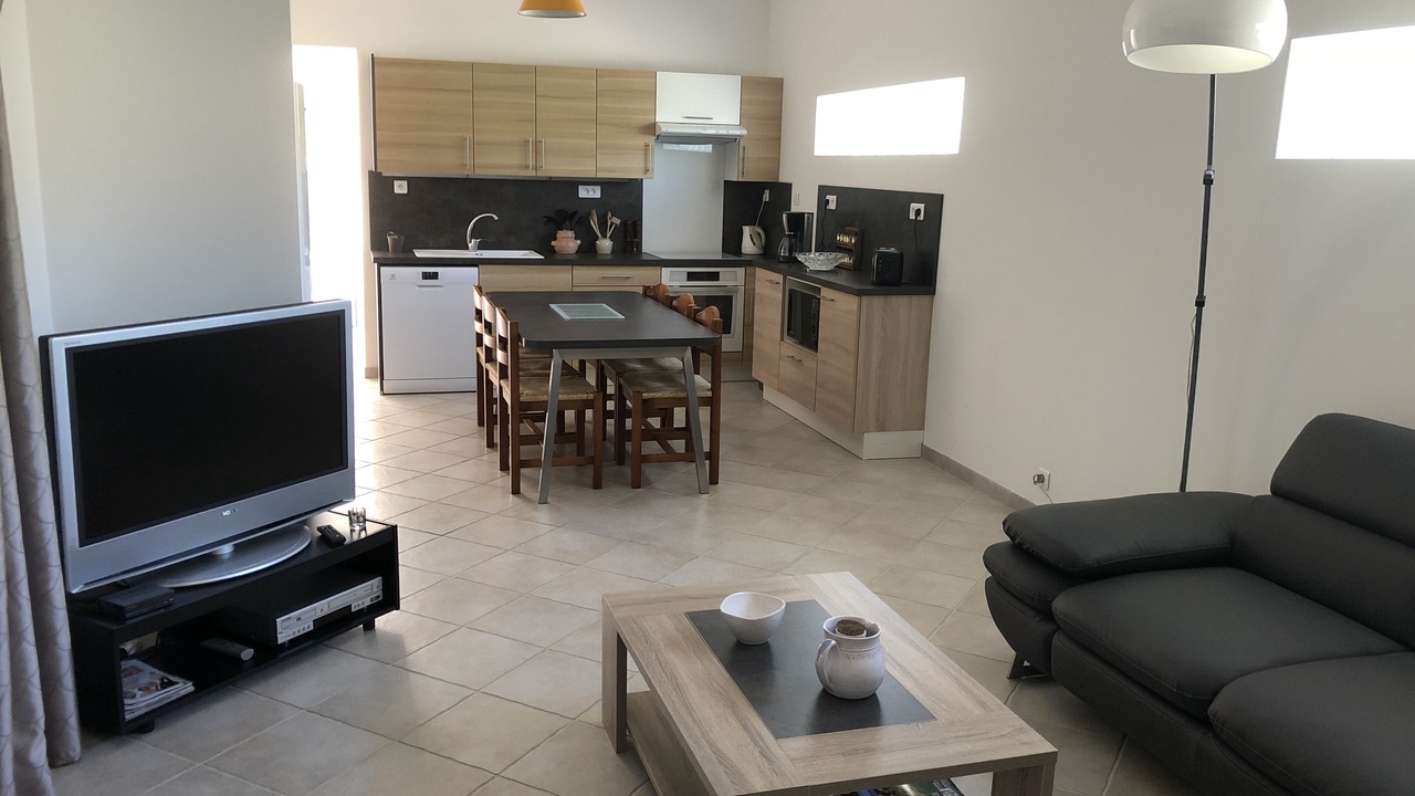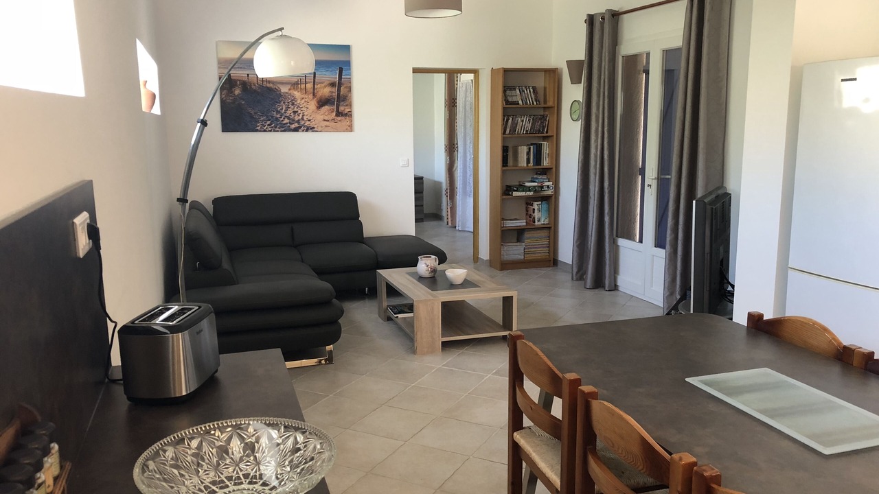 - 1 large bright air-conditioned room with dining kitchen equipped, living room with large corner sofa, overlooking the terrace (2 French doors).