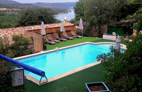 On the heights, exceptional view (lac de Ste Croix), in a quiet, contemporary House with 4 gites. Common ground of 1900 m² terraced, shared swimming pool (11mx5mx1m40) secured by alarms, sunbathing, BBQ joint. Private front terrace cottage with garden. 1 animal accepted. Parking space for 1 vehicle. Attention path steep but passable. Ground floor: kitchen open to the living room, wc, lounge with TV, terrace access. 1st floor: entrance, 1 bedroom with 1 bed 2 pl, 1 bedroom with 2 beds 1 bathrooms, dry towel el. Electric heating. Internet access in all rooms.