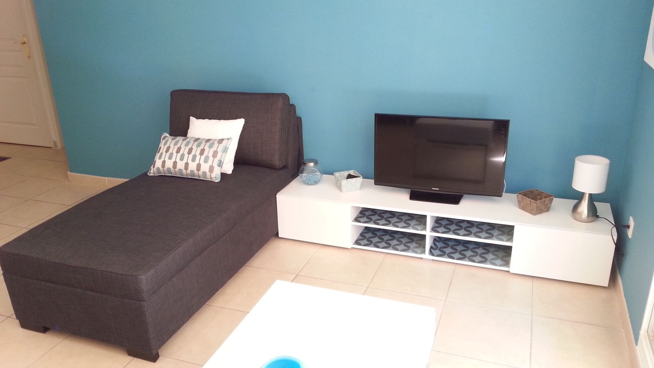 The living room is equipped with a convertible corner sofa and TV 80 cm Led overlooking the bay window of the terrace