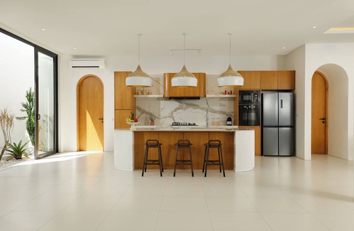 Inspired by the Indonesian word "Kalem," meaning "calm" or "serene," Villa Kalem lives up to its name as a tranquil retreat in the heart of Berawa, Canggu. This luxurious four-bedroom villa offers a unique blend of modern minimalist design with a touch of desert-inspired tropical style. With sleek white walls, natural wooden accents, and cactus-themed decor, the villa creates a stylish, relaxed atmosphere. Located close to popular hotspots like Atlas Beach Fest and Finns Beach Club, Villa Kalem provides an ideal setting for those seeking both serenity and easy access to Canggu’s vibrant scene. A private driveway and secluded parking area ensure privacy and ease from the moment you arrive.