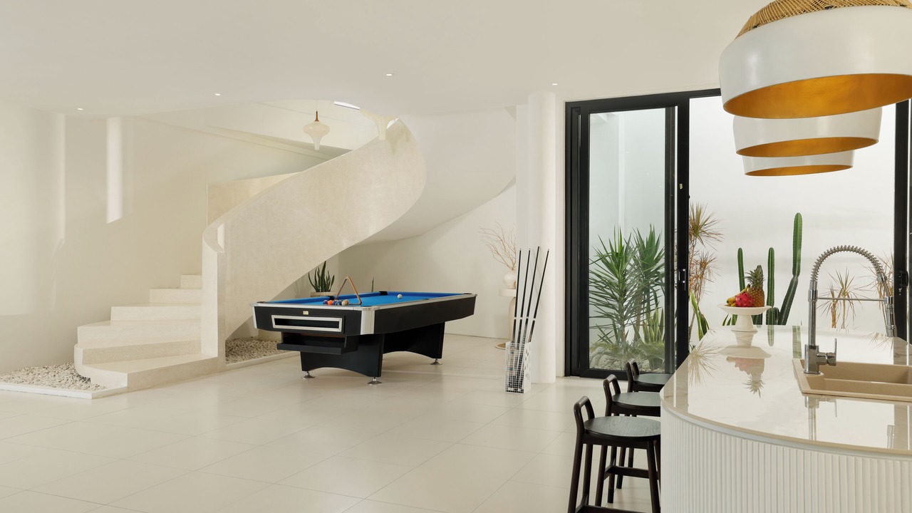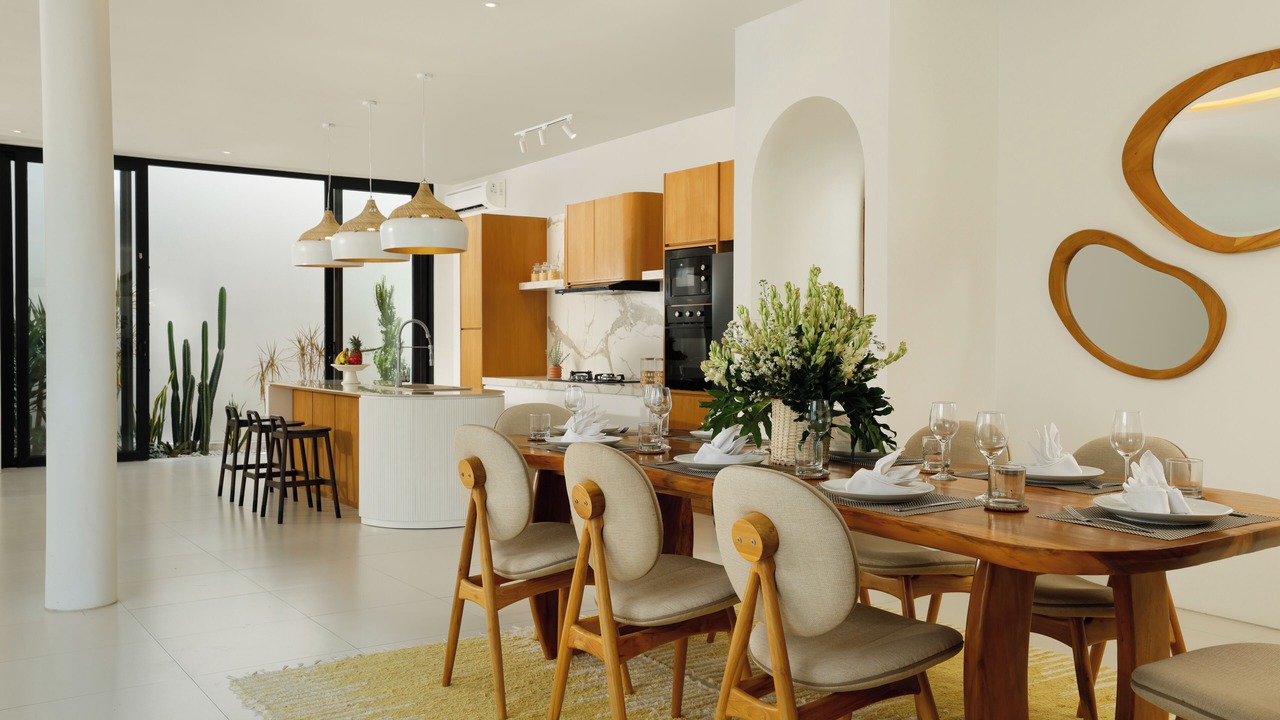 The villa’s open-plan living area is designed for relaxation and connection, featuring cozy white lounge sofas with earthy-toned pillows and soft blankets that invite you to unwind. The living room flows seamlessly into the dining and kitchen areas, where a marble kitchen island with seating for three provides the perfect spot for casual gatherings. The spacious dining area, anchored by a long wooden table seating up to eight guests, is ideal for family meals and celebrations. Each corner is thoughtfully decorated with natural textures, mirrors, and wooden accents, creating warmth and style. Adjacent to the stairs, a pool table offers a touch of entertainment, perfect for unwinding after a day out in Canggu.