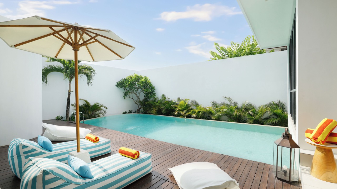 The villa’s outdoor space is a peaceful escape, featuring a long swimming pool with two bean bag-style sunbeds and a large umbrella for shaded relaxation. Surrounded by the open, clean lines of Villa Kalem’s modern architecture, the pool area offers a refreshing contrast to the nearby bustling scene of Berawa.