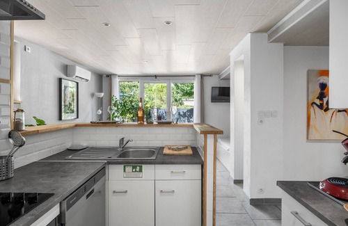 The studio apartment "Villa Nui" is located in Cuers. This 40 m² property consists of a living/sleeping area, a fully-equipped kitchen, 1 bathroom, and 2 additional toilets, and can accommodate 4 people. On-site amenities include Wi-Fi with a dedicated workspace for home office, a TV, air conditioning, a fan, a washing machine, and a dishwasher. A baby cot is also available.