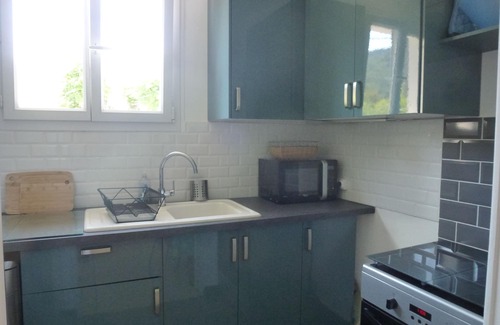 A living room with sofa bed, a bedroom, a kitchen and a bathroom upstairs and a bedroom on the ground floor, facing the pool, with access from the outside.