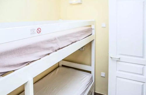 Composition of the living room: 2 sofa beds including 1 with trundle bed (3 beds including 1 bed recommended for a child). 1 cabin area with 2 bunk beds (sleeps 2). Meal side: a table with 6 chairs and 1 stool.
